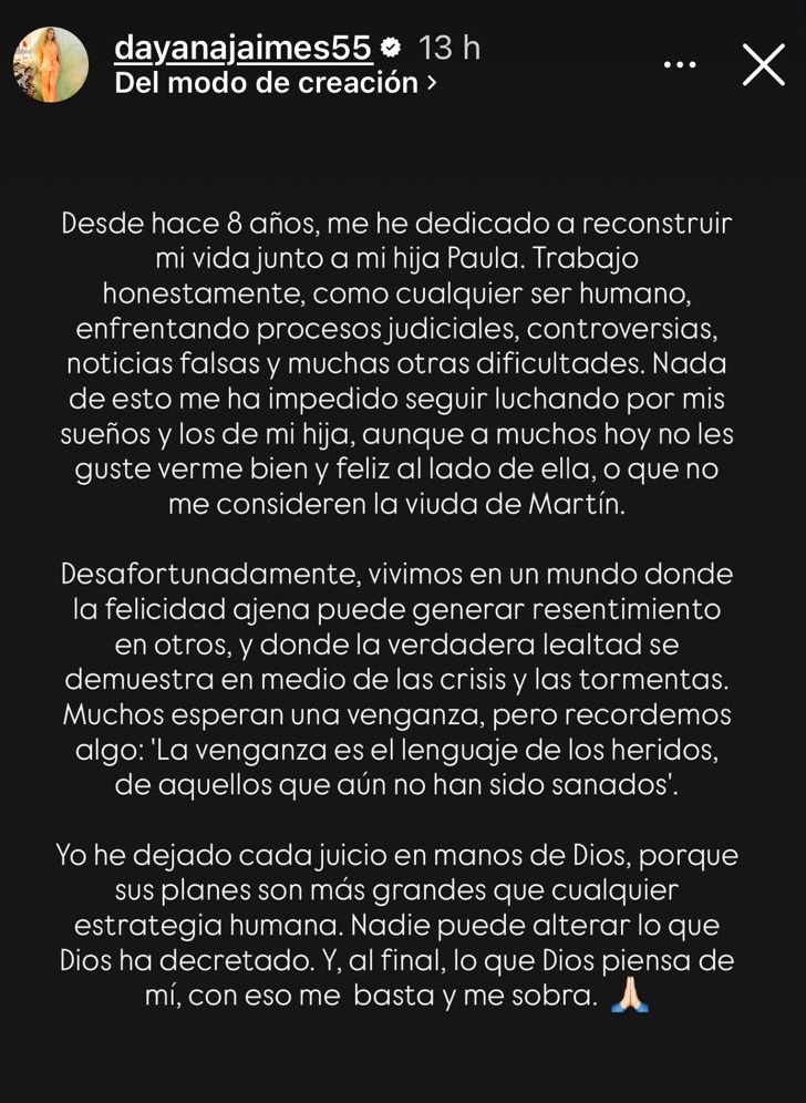 También rechazó los señalamientos y rumores que, según ella, han intentado poner en duda su pasado junto al fallecido cantante Martín Elías Díaz Acosta. “Agradezco sinceramente a todas las personas que me han apoyado en este camino. Sé muy bien quiénes me han acompañado de manera sincera, quién fui en la vida de Martín y quiénes se disfrazan mostrando una realidad que no es la suya”, puntualizó.