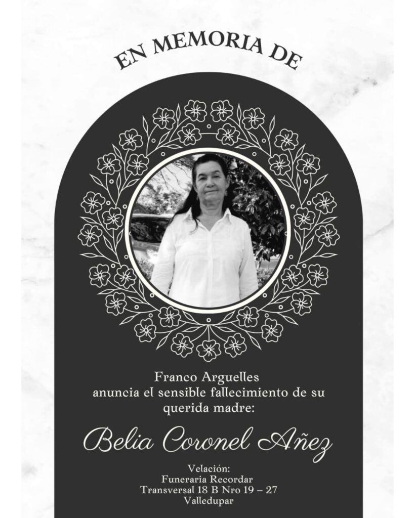 Belia Coronel Añez, madre del acordeonero Franco Argüelles, falleció la mañana del jueves 20 de febrero en la ciudad de Valledupar. Así lo informó el músico en su cuenta de Instagram.