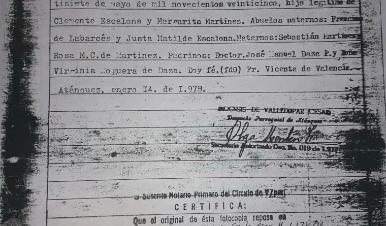 En entrevista para ‘Mi Diario Informador de Paz’, Augusto Escalona, sobrino de Rafael, compartió la partida de bautismo del compositor y en esta el día de su nacimiento es el 27 de mayo en Patillal, corregimiento de Valledupar.