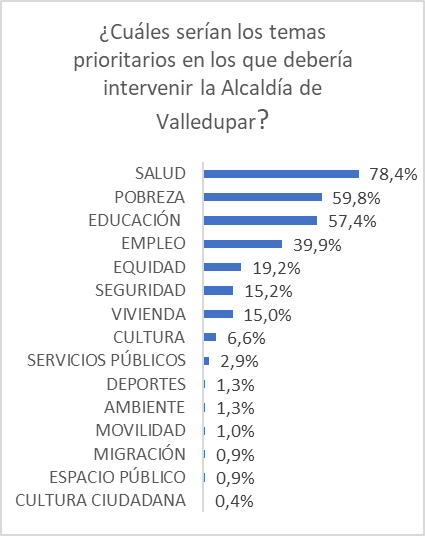 Según los resultados extraídos, un gran porcentaje de los habitantes de Valledupar esperan que la administración municipal en cabeza de Ernesto Orozco Durán, quien recién empieza, ponga el foco en salud, pobreza, educación y empleo (Gráfica 1).