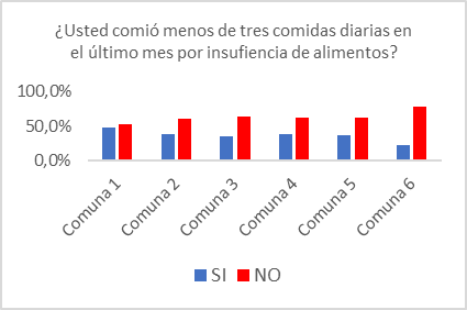 Lo que sí marcó alarmas de preocupación fue el hecho de que 37% de los hogares encuestados consumió menos de tres comidas diarias en el mes anterior a la realización de la encuesta por insuficiencia de alimentos (Gráfica 2), siendo la comuna 1, con 47,4%, donde más familias dejaron de comer adecuadamente.