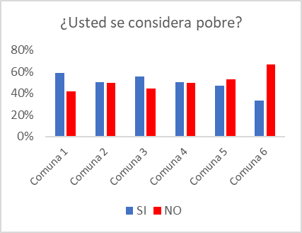 Al analizarlo por comunas, encontramos que la gente se considera pobre en mayor proporción en las comunas 1 y 3, con unos porcentajes de población que respondieron afirmativamente en 59% y 56%, respectivamente (Gráfica 3).