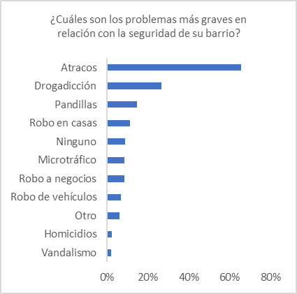 Por último, aunque la seguridad no es parte de las tres prioridades que se obtuvieron en la EPC, queremos resaltar que los problemas más importantes que destacaron los encuestados como factores de inseguridad en sus barrios, a saber, son atracos callejeros, drogadicción y pandillas (Gráfico 4).