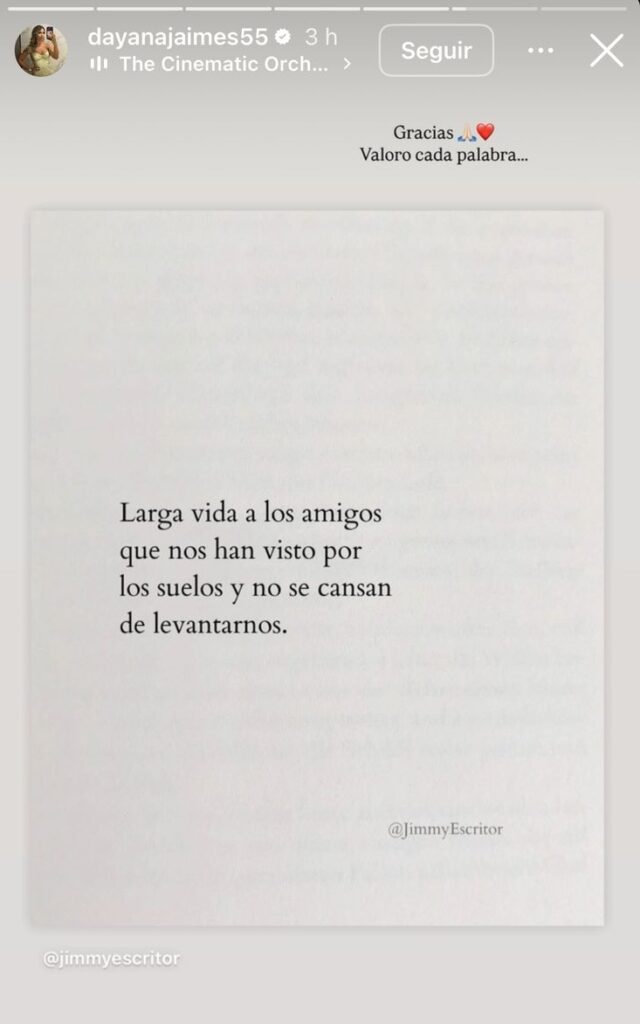 En su cuenta de Instagram, Jaimes compartió una reflexión sobre el valor de la amistad y un agradecimiento a las personas que la apoyan en sus duros momentos. “Larga vida a los amigos que nos han visto por los suelos y no se cansan de levantarnos. Gracias, valoro cada palabra”, se lee en sus redes sociales.